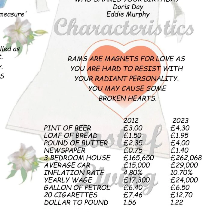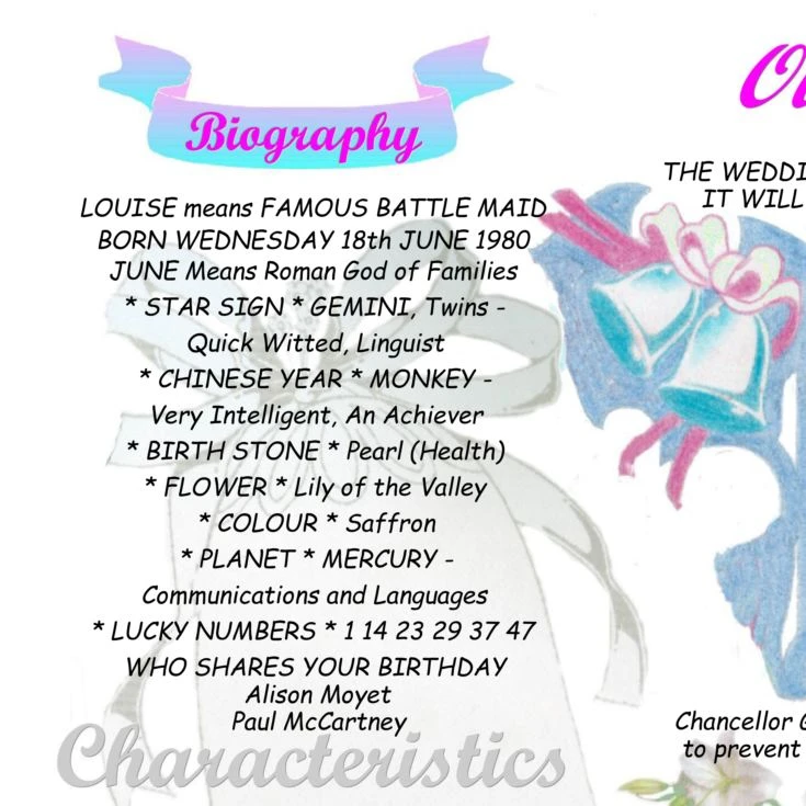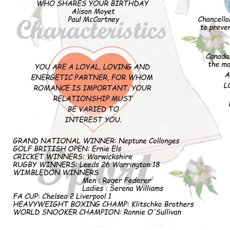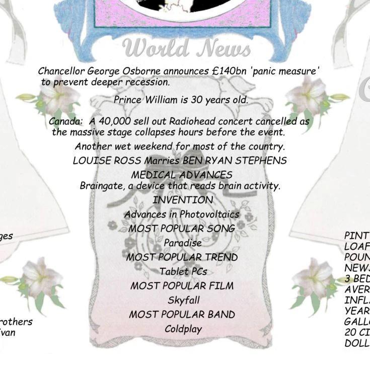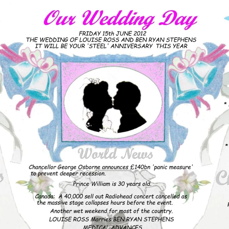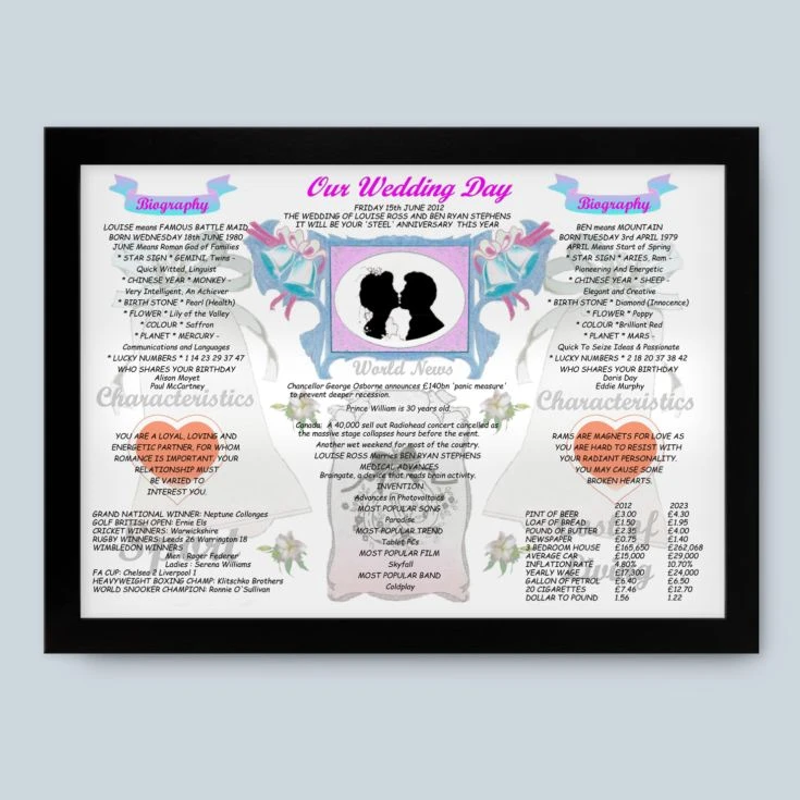 Our Wedding Day Chart is full of fascinating facts about the day of the marriage from facts about films, songs, sport, news and prices of products such as newspapers, bread etc.