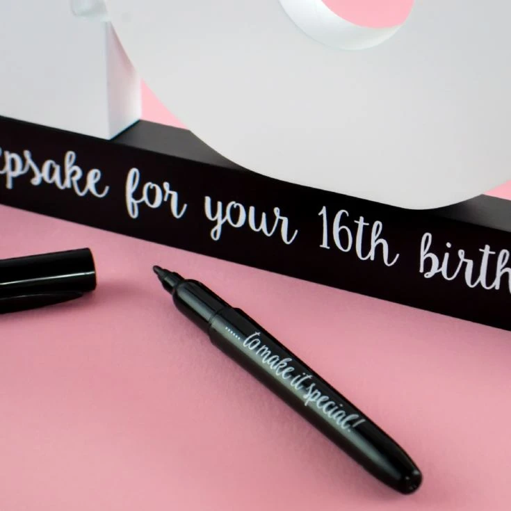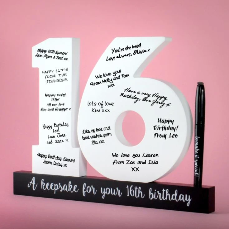 Celebrate the sweet 16 with this trendy 16th Birthday Signature Number! Use the bold, stylish numbers as a decoration and a guest book for this momentous birthday. Family and friends can use the marker pen to leave special messages and birthday wishes for the guest of honour. The white numbers stand high on a sleek black base that reads “Happy Birthday.” After the party, the birthday person can showcase the numbers in their home, treasuring the special birthday messages for years to come. A great gift for anyone who’s turning 16! Product Reference: FM-ROY007