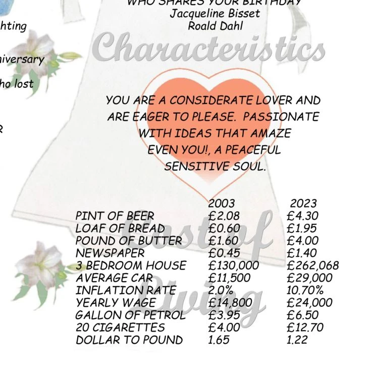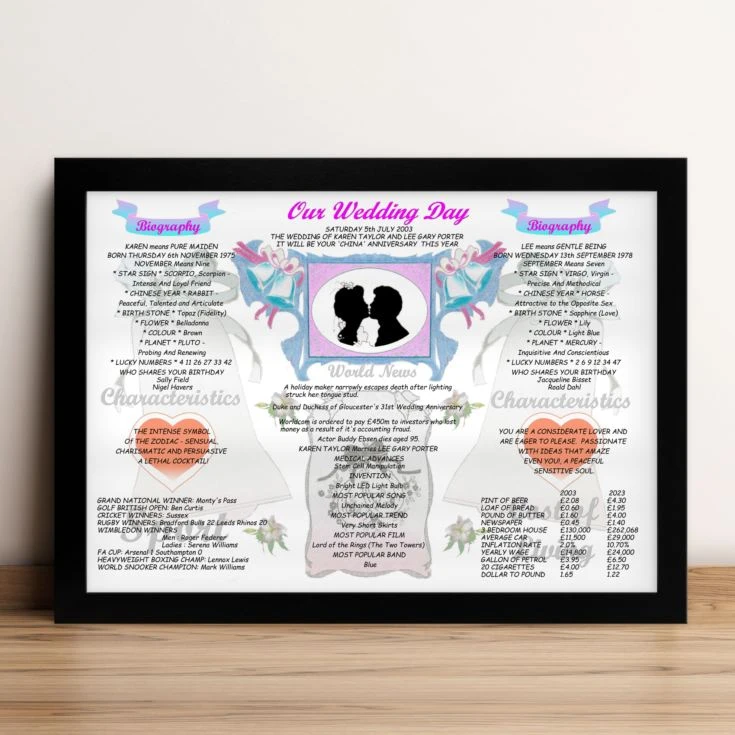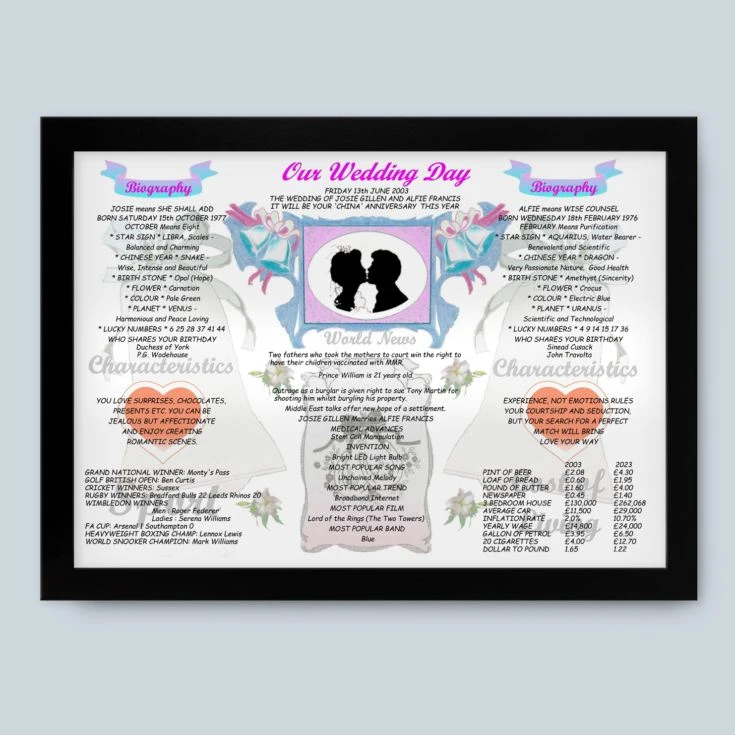 Our Wedding Day Chart is full of fascinating facts about the day of the marriage from facts about films, songs, sport, news and prices of products such as newspapers, bread etc.