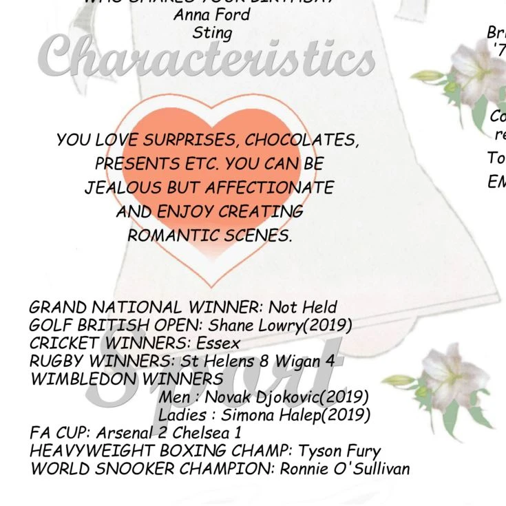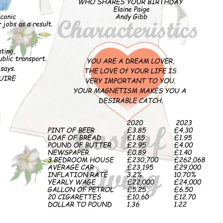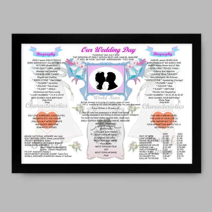 Our Wedding Day Chart is full of fascinating facts about the day of the marriage from facts about films, songs, sport, news and prices of products such as newspapers, bread etc.