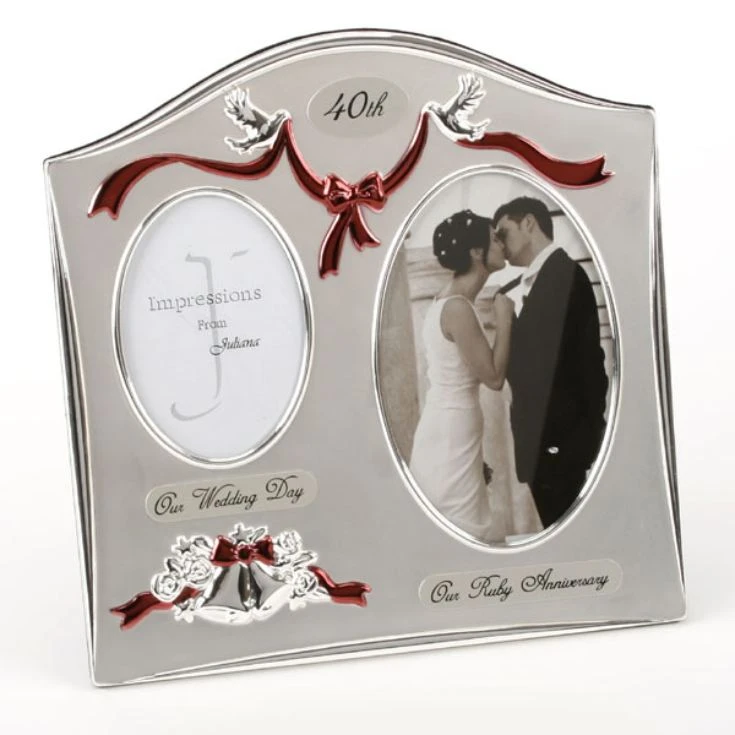Two Turtle Doves are at the top of the frame holding a Red Ribbon that hangs over the photographs, at the top of the frame is a plaque saying 40th.