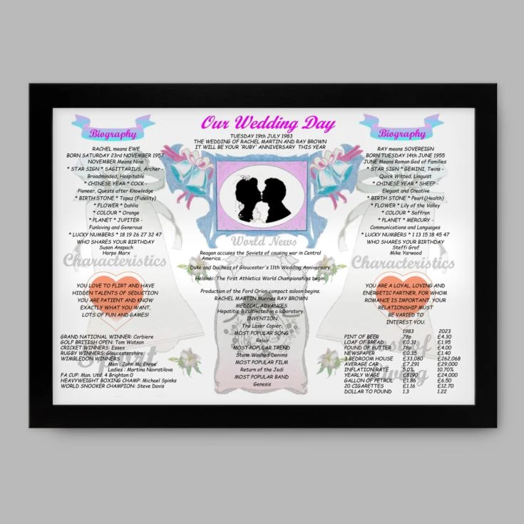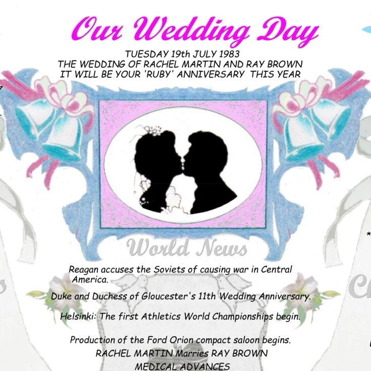 Our Wedding Day Chart is full of fascinating facts about the day of the marriage from facts about films, songs, sport, news and prices of products such as newspapers, bread etc.