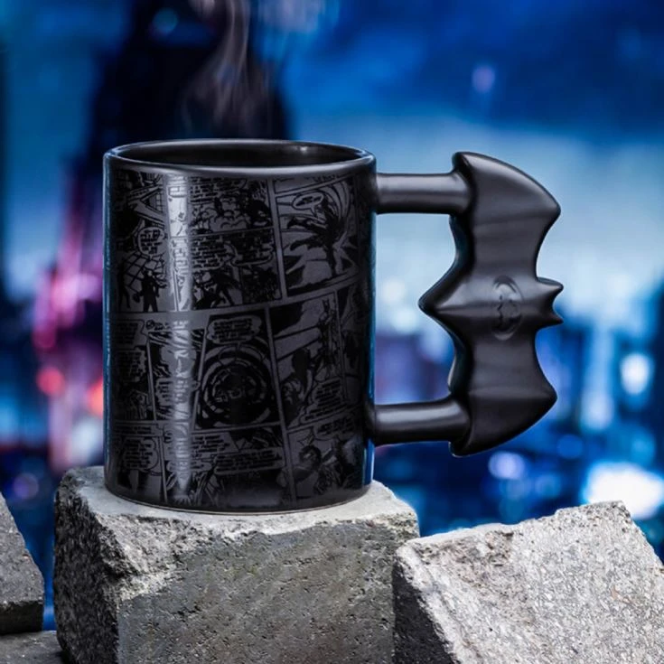 It features a Batarang handle, the weapon used by Batman since 1939, and an intricate comic strip piece which fully wraps around the mug in a black, tonal design.