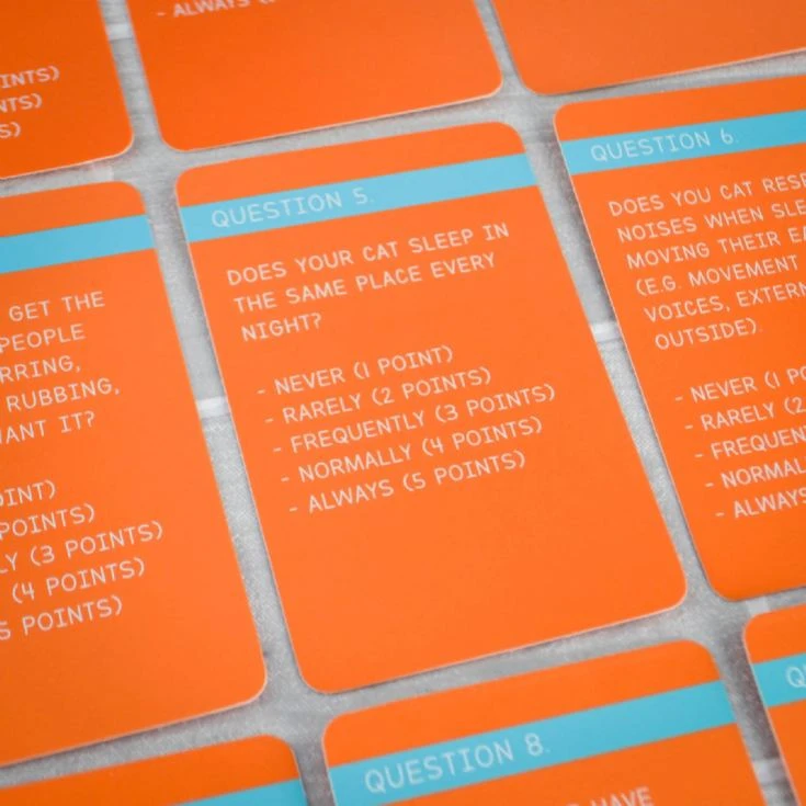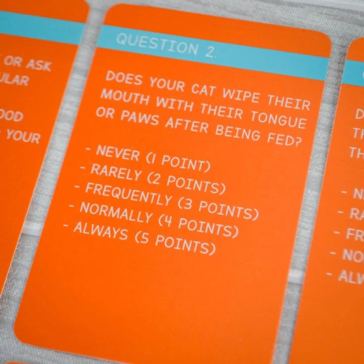 A question example refers to food preparation: if they recognise their dinner being distributed, that’s an instant 3 point win. A test example challenges your feline’s memory skills: choose a room where your cat frequently sits, take them out and move the furniture around. When the cat is let back in, if they head to their favourite spot (now in a different location), they’ve got a high IQ.