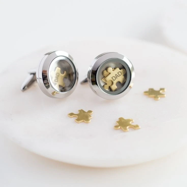 A perfect gift for a special Dad, these locket style cufflinks, each cufflink filled with two tiny puzzle pieces in a choice of either raw brass or stainless steel. One piece in each cufflink is engraved with DAD. Enclosed with the cufflinks is a card reading ‘I love you to pieces’.
