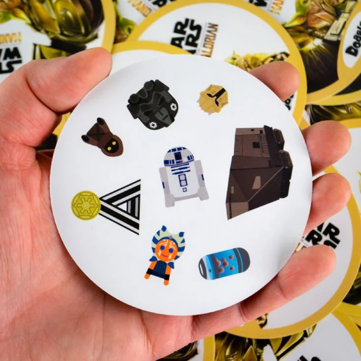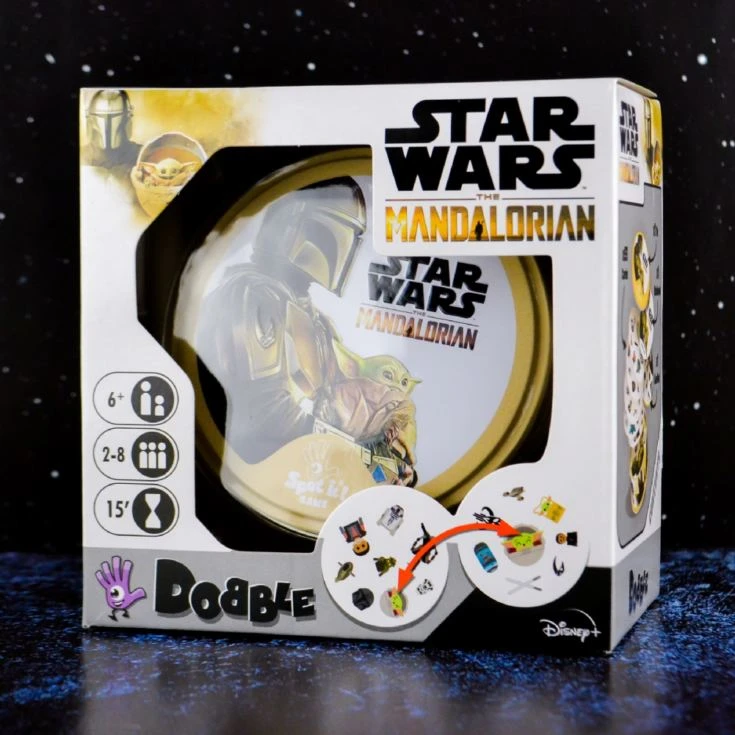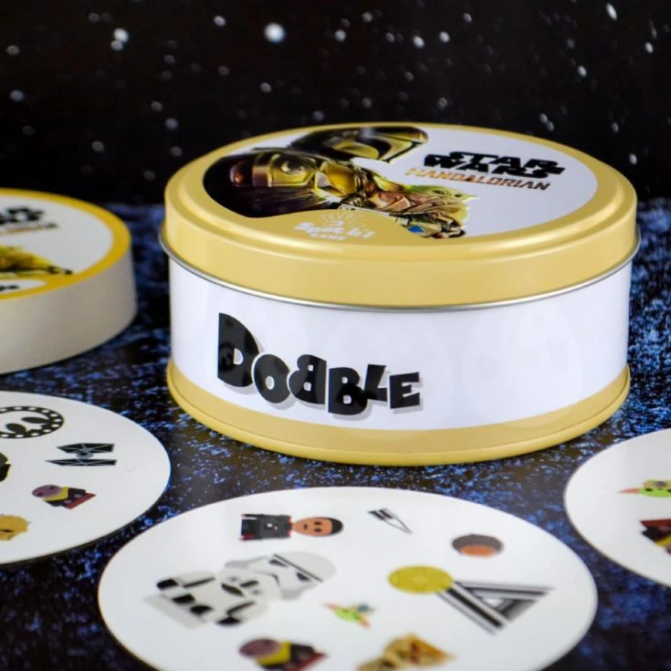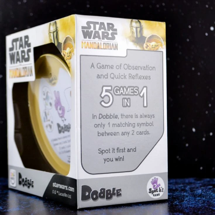 A game of observation and quick reflexes. In Dobble there is always 1 matching icon between any 2 cards. Spot it first and you win! 55 cards, 5 quick party games for 2 to 8 players. Now themed with all your favourite Star Wars characters! Every card is unique and has only one symbol in common with any other in the deck. 2-8 players, ages 6+. Average game time 15 mins. Product Reference: FM-ASM002