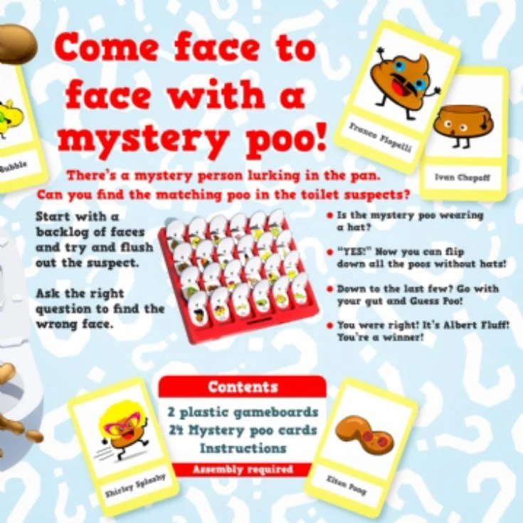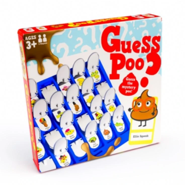 The premise of the game is the same. Ask revealing questions about the poo characters such as “Do they wear glasses?”, “Does he have a moustache?” or “Are they wearing a hat?”. Pop down the toilet lid of all those who don’t fit the bill. Is it Shirley Splashy or Elton Pong? Who knows until you flush out the skidding suspect and are crowned King/Queen of the Floaters (or whatever pooptastic name you prefer!).