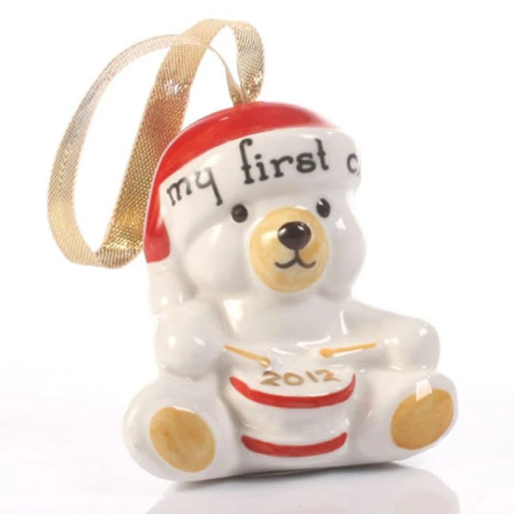 This little Teddy is a real character, his little Santa hat has the words ‘My First Christmas’ or Merry Christmas’ on it, and he is personalised with a name and year writen in real gold plus a gold double edged ribbon to hang straight onto the tree.
