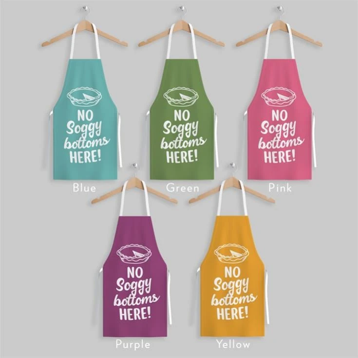The apron features a pie illustration at the top of the design, followed by the words “No Soggy Bottoms Here!” in a mix of uppercase, lowercase, italicised and normal letters.