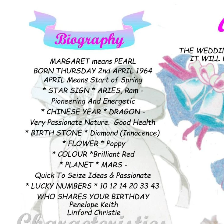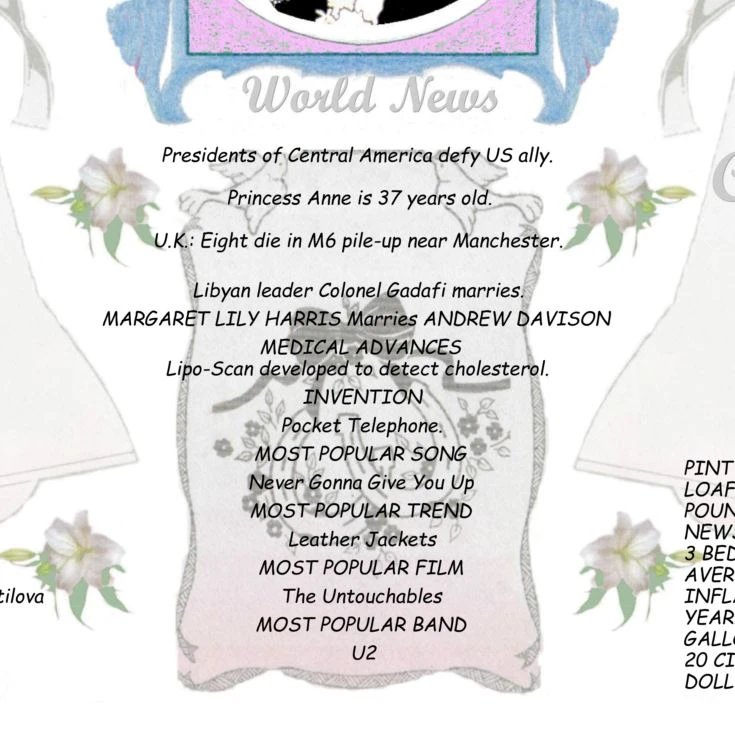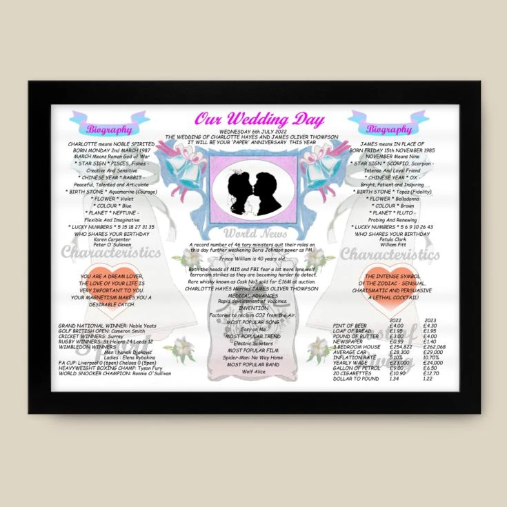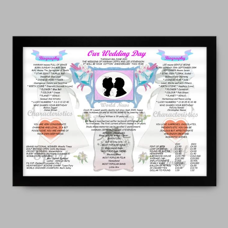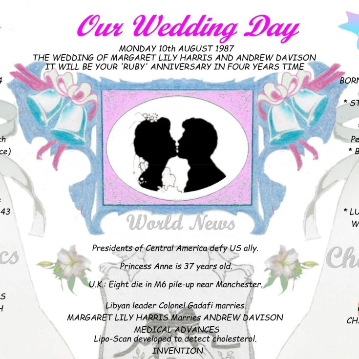 Our Wedding Day Chart is full of fascinating facts about the day of the marriage from facts about films, songs, sport, news and prices of products such as newspapers, bread etc.