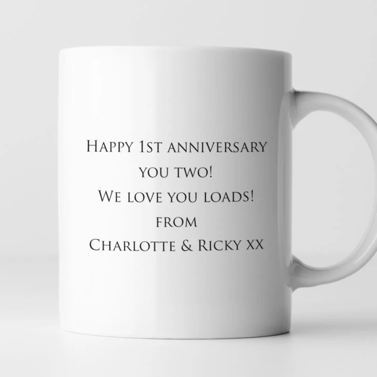 This Pair of Personalised First Anniversary Mr & Mrs Mugs are personalised with the couples surname, the words ‘First Wedding Anniversary’, the date of their wedding, and a personal message on the back. All the text is framed in a lovely silver coloured crest.