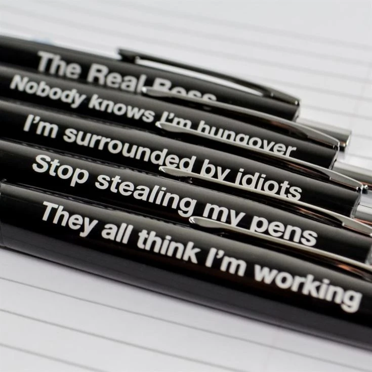Ever wish you could share a message with someone at the office without getting in trouble for it? Now you can, with these Pens with Attitude! These ballpoint pens each have a funny, unique message embossed on the side of the pen. Share things like: I’m the Real Boss, they all think I’m working, I’m surrounded by idiots, nobody knows I’m hungover, stop stealing my pens. These pens are a great gift for a co-worker, boss, or friend. Or get them for yourself to liven up the mood in the office! Grab your five-pack today! Product Reference: FM-FUN387