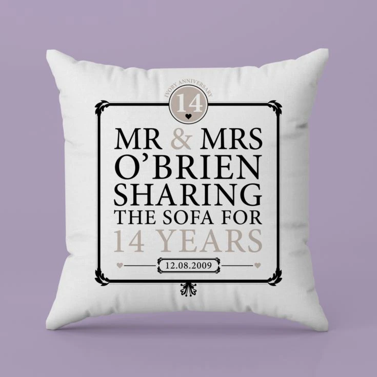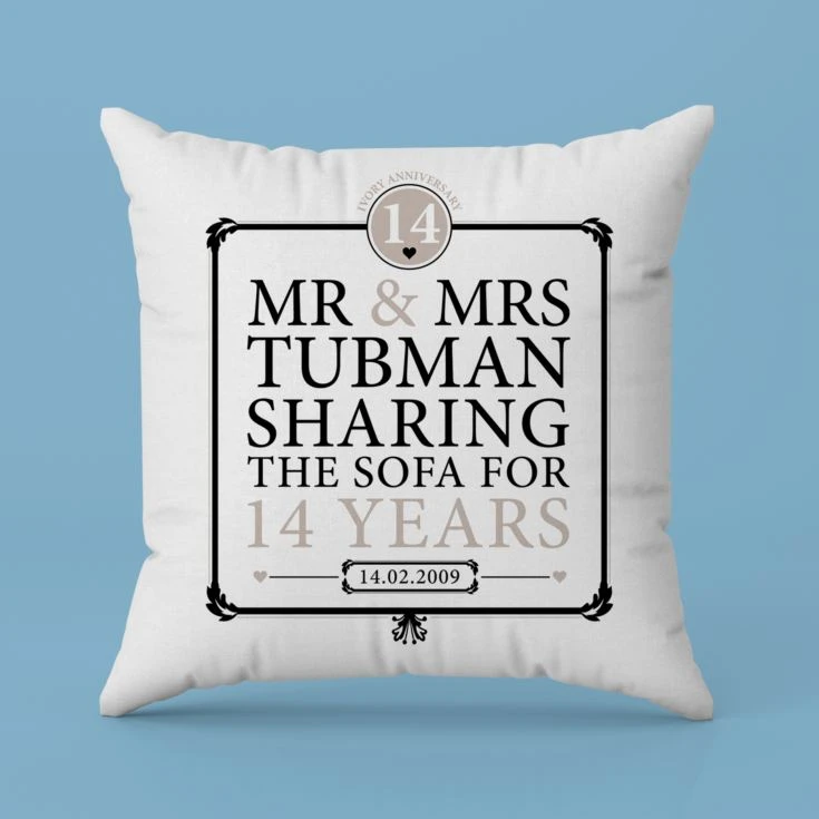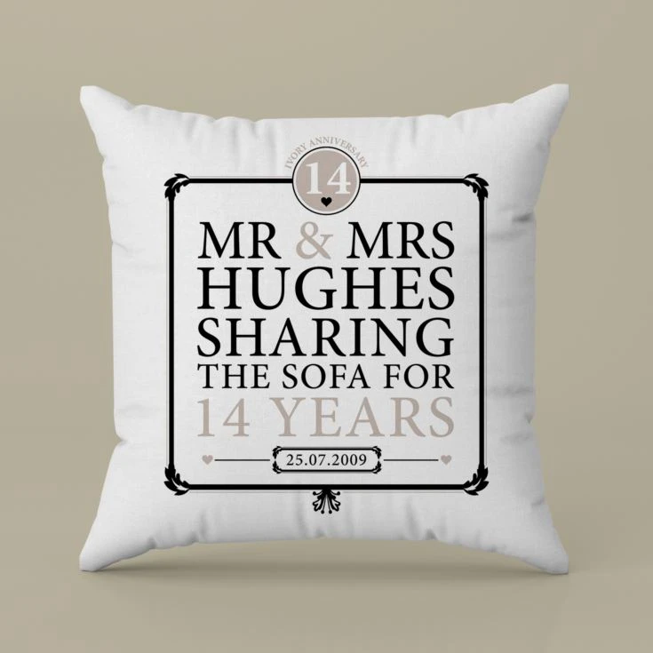 It’s classic design on the pure white background really makes this cushion pop, with a simple border framing the words ‘Mr & Mrs (insert name) Sharing The Sofa For 14 Years’ in both a black and Ivory coloured font. You are able to personalise the cushion with the name of the happy couple, as well as including the date of their special day to remind them of it every time they have a sit down.