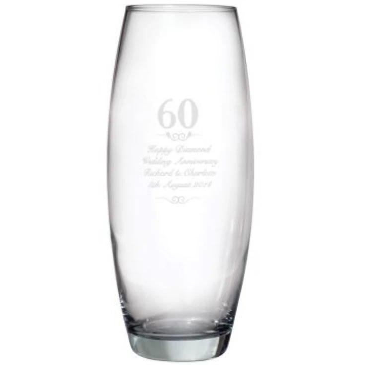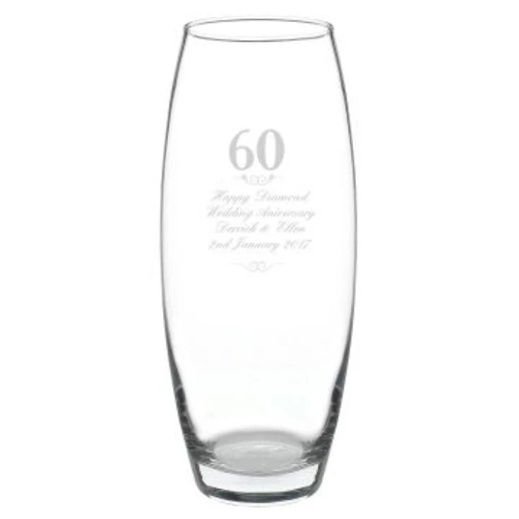 What better way to mark such a milestone than with a special personalised gift! Our 60th Anniversary Vase makes the perfect diamond wedding anniversary gift and can be customised with a special message over 4 lines. It features a large ’60’ and scroll motifs as standard and is a wonderful keepsake whether displayed empty on a shelf or filled with fresh flowers!