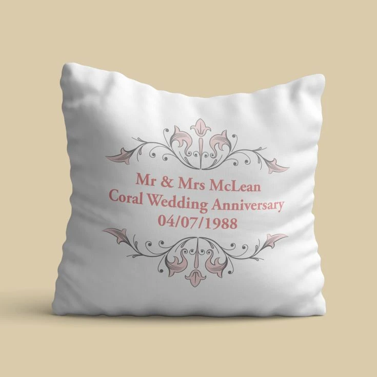 The couples name, the words Coral Wedding Anniversary and the dates of the wedding and anniversary are printed onto the cushion and all the text is framed in a lovely ruby coloured floral crest. A wonderful gift to celebrate a coral wedding anniversary and thirty five glorious years together.