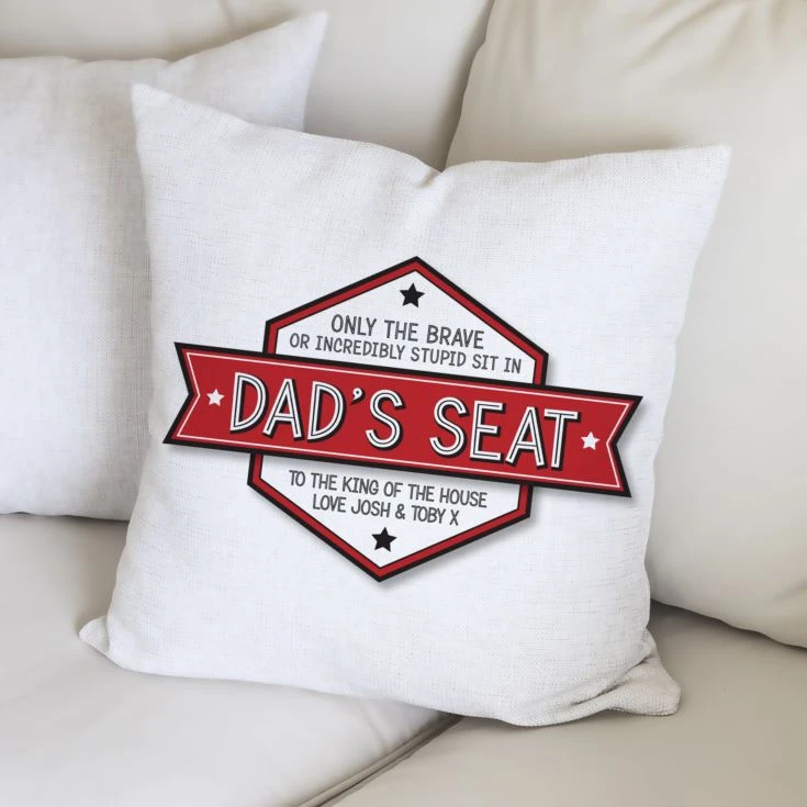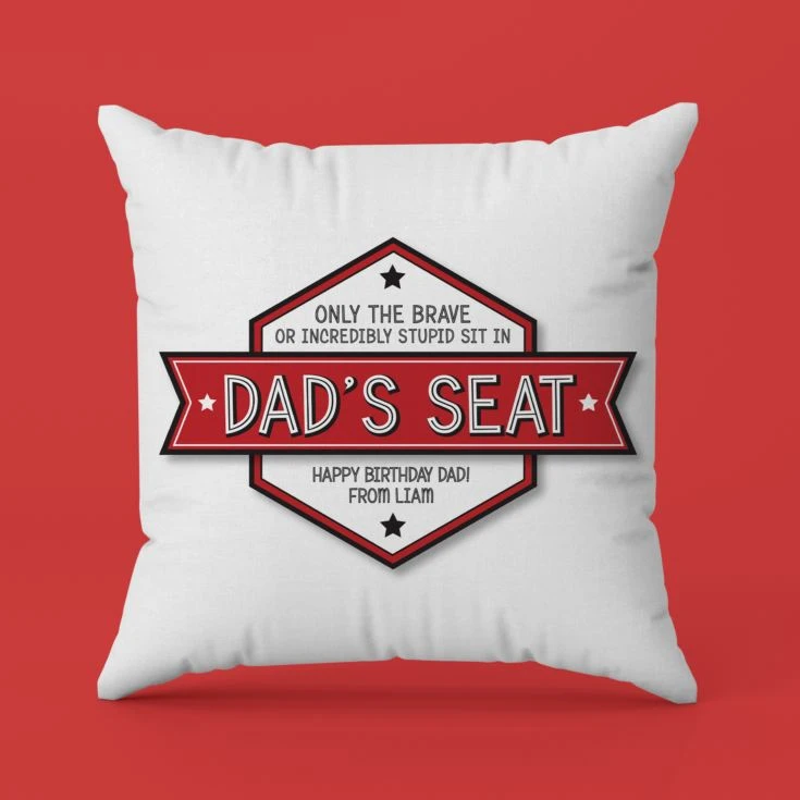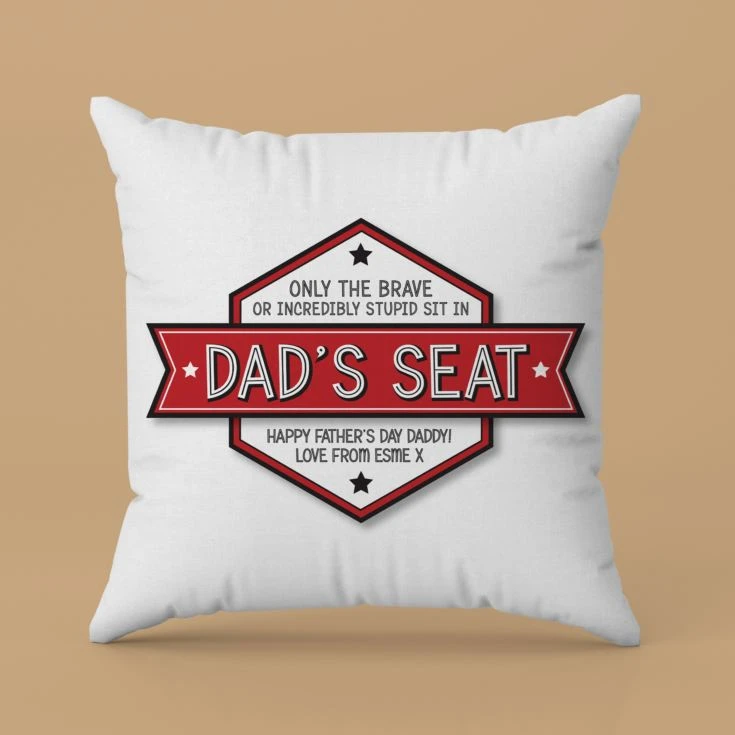 The Personalised Dad’s Seat Cushion features the words ‘Only the brave or incredibly stupid sit in’ followed by ‘Dad’s Seat’ underneath in a red banner through the centre of the cushion design.