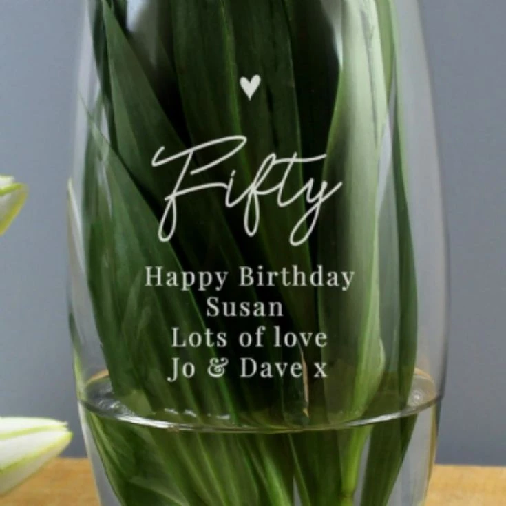 Reaching the big age of 50 deserves a gift filled with love. This personalised glass vase will provide beauty and promise to your loved one, especially as your own heartfelt words feature on the front.