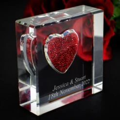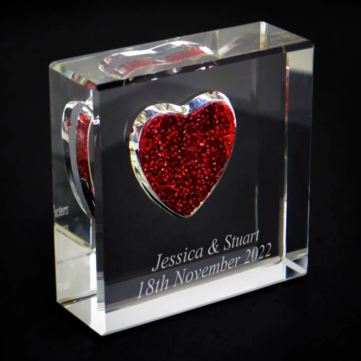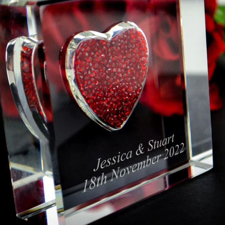 This stunning crystal paperweight makes a wonderful and romantic declaration of love. This crystal paperweight is personalised with a message of your choice and features a heart shape embedded with sparkling, deep red ‘Diamante’ crystals.