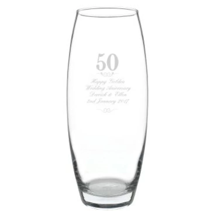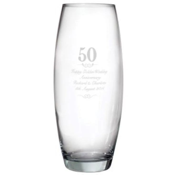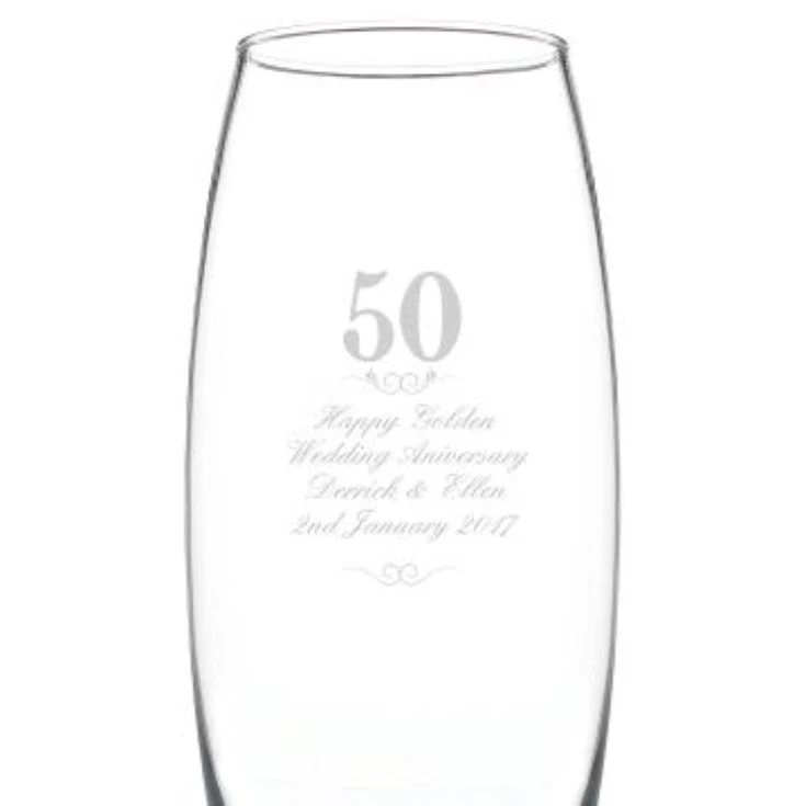 What better way to celebrate 50 fabulous years than with a special keepsake like this! Don’t just get her a bunch of flowers this year, twin it with our Golden Wedding Anniversary Vase for the perfect personalised gift. This stunning glass bullet vase can be customised with a message of your choice over 4 lines (20 characters per line) and already features a swirl motif and ’50’ at the top.