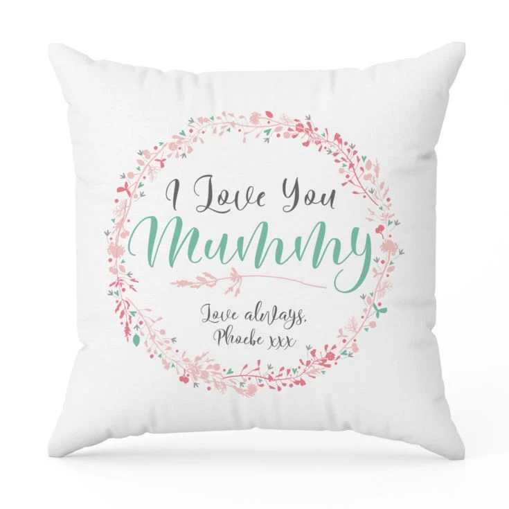 This personalised cushion has a beautiful featured design, with a floral wreath surrounding the words ‘I Love You Mummy’ that are printed in a gorgeous flowing font. The pastel colours compliment each other perfectly, giving it that extra soft and loving touch.
