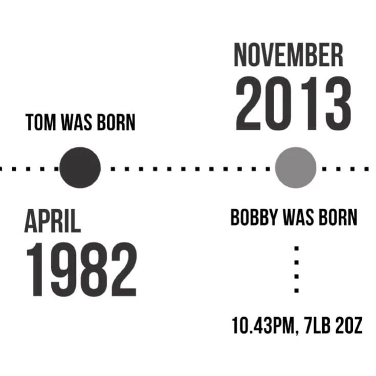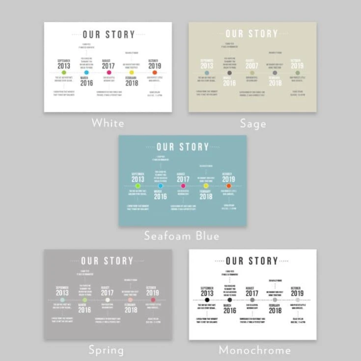 Simply provide us with 5 key dates and 1 or 2 lines of explaination; such as when you met, your first kiss, the first time you stayed up all night playing Scrabble, the day you got married and where… whichever days you like to look back on the most. Then our talented design team will transform your story into a bespoke timeline, artfully designed just for you, in your choice of colour scheme.