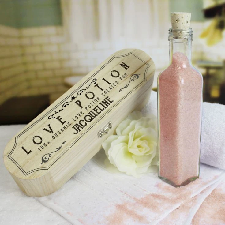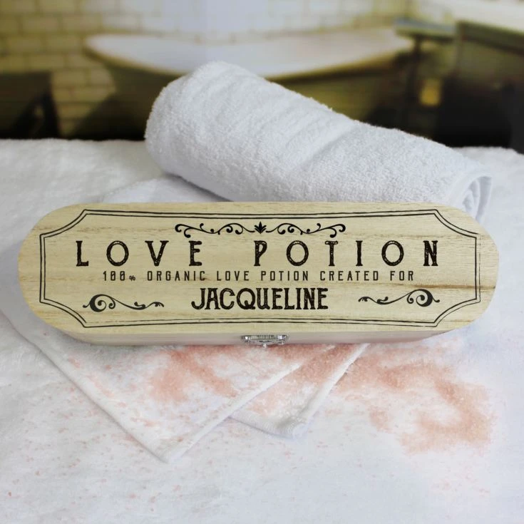 • Wooden Love Potion Box, Glass bottle contaatign 300g of Himalayan bath alts.