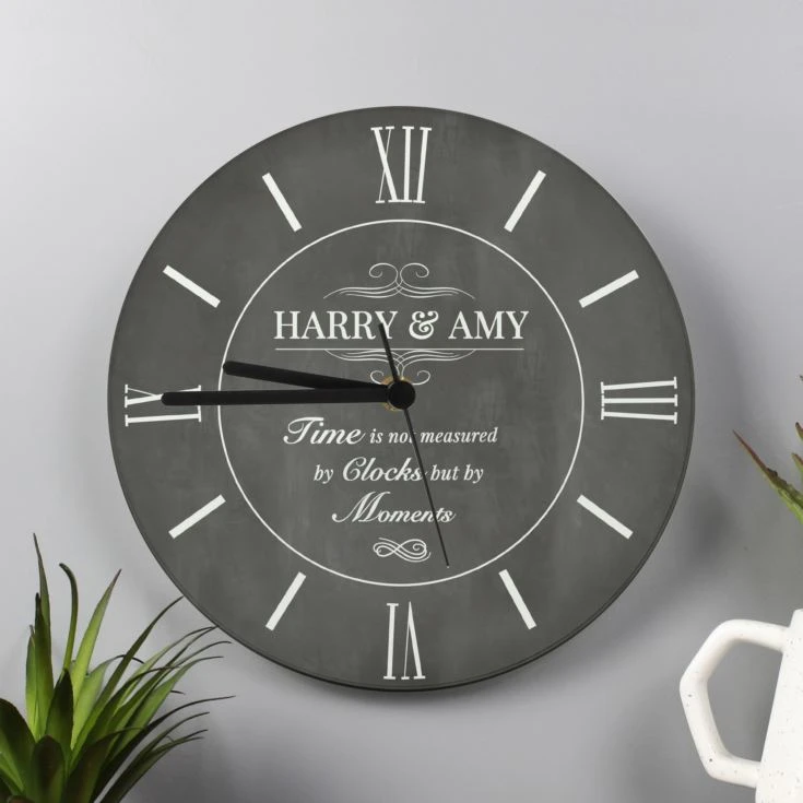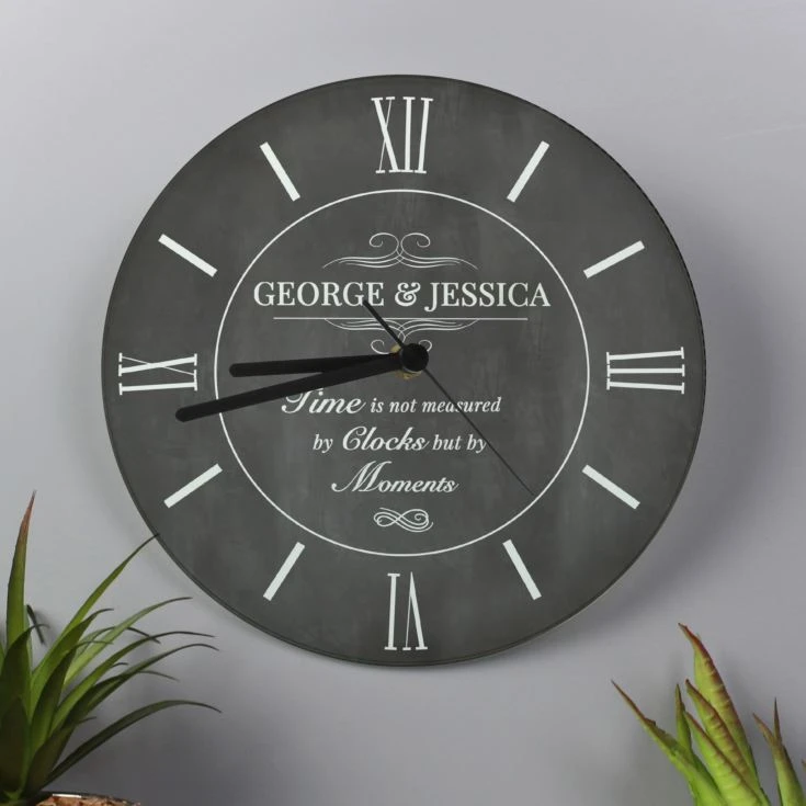 Your personalised name will sit at the top of the clock in uppercase text, followed by “Time is not measured in by clocks but by moments” which is a fixed print and cannot be changed.
