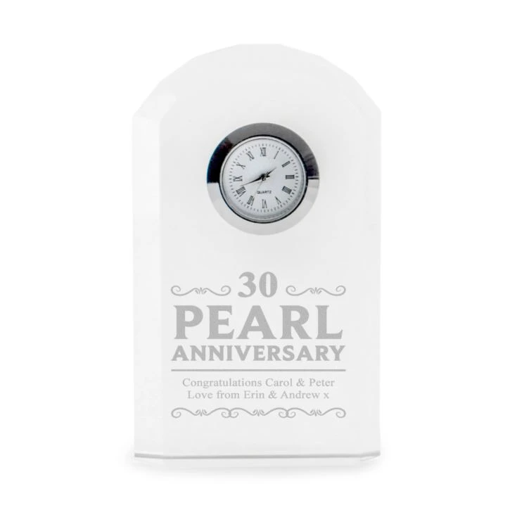 This gorgeous Engraved Pearl Wedding Anniversary Mantel Clock is handcrafted out of perfectly clear optical crystal and the lovely Pearl Anniversary design on the front of the clock makes this the perfect gift for any couple celebrating 30 years of marriage. Marking the passage of time, this truly would be a celebration of the 30 wonderful years they have had together.