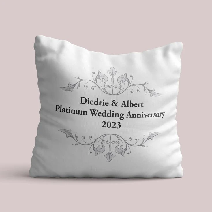 The couples name, the words Happy Platinum Anniversary and the dates of the wedding and anniversary are printed onto the cushion and all the text is framed in a lovely silver coloured floral crest. A wonderful gift to celebrate a diamond wedding anniversary and sixty glorious years together.
