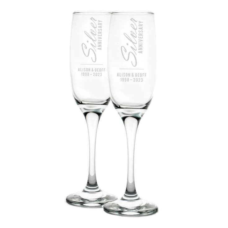 The words Silver Anniversary are engraved horizontally at the top of the flutes which gives the glasses a very stylish and modern look and then underneath we will engrave them with the names of the couple and the date of the anniversary or alternatively a personal message, the choice is yours.