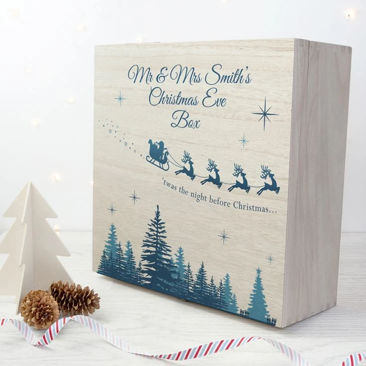 The box design features Santa’s on his sleigh flying over the trees, a name and the words ‘Christmas Eve Box’.