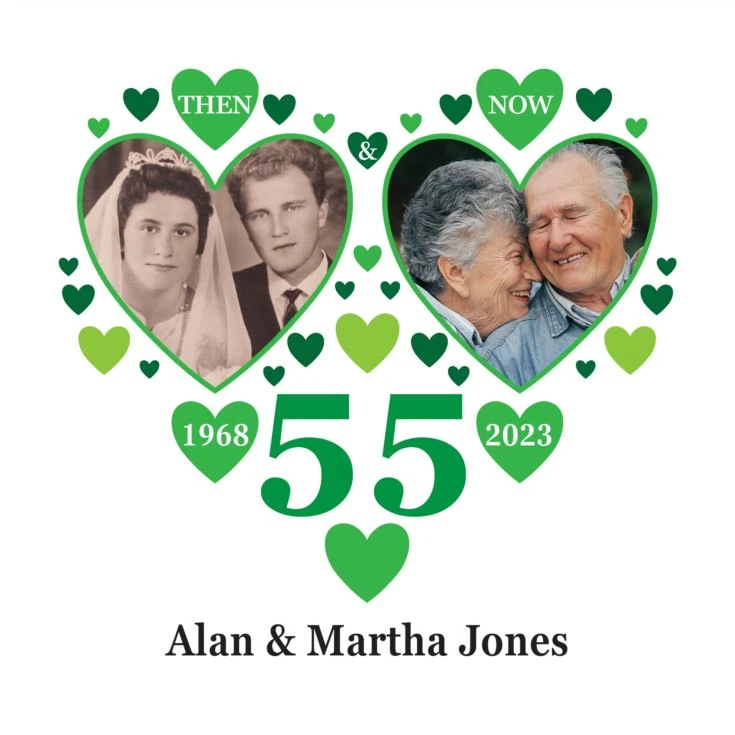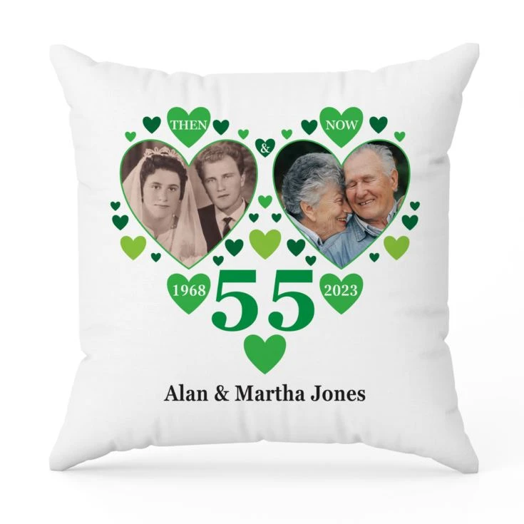 The pictures you provide will be printed inside the lovely green coloured hearts with the “then” photo being on the left and the “now” photo on the right. With a mass of green hearts the cushion also features the number 55 with the year of the wedding printed in a heart to the left and the year of the anniversary in the heart to the right. Just add their names at the bottom of the cushion and you can present this delightful personalised gift to them on their anniversary.