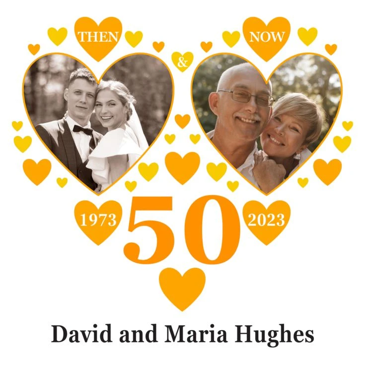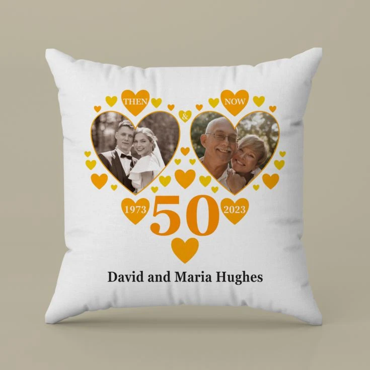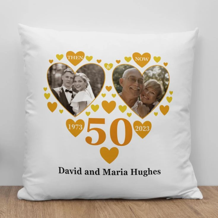 The pictures will be printed inside the lovely golden hearts with the then photo being on the left and the now photo on the right. With a mass of golden hearts the cushion also features the number 50 with the year of the wedding printed in a heart to the left and the year of the anniversary in the heart to the right. Just add their names at the bottom of the cushion and you can present this delightful personalised gift to them on their anniversary.