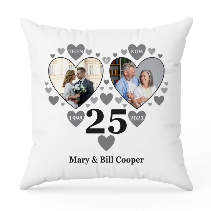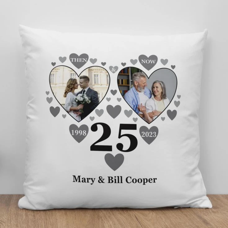 The pictures will be printed inside the large hearts with the “then” photo being on the left and the “now” photo on the right. With a mass of scattered silvery grey hearts the cushion also features the number 25, with the year of the wedding printed in a heart to the left and the year of the anniversary in the heart to the right. Just add their names at the bottom of the cushion and you can present this delightful personalised gift to them on their anniversary.