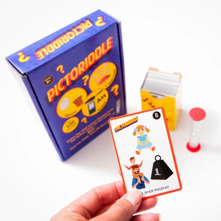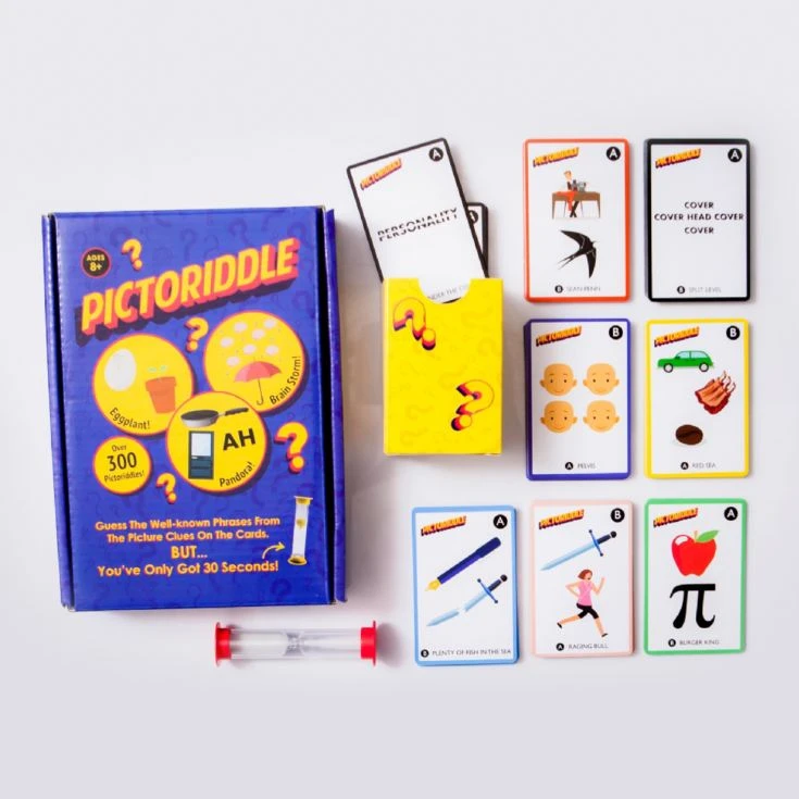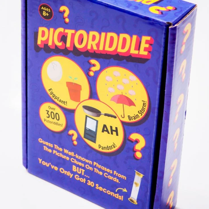 Start game night with this fast-paced, mind-boggling Pictoriddle Game. The game is simple, but simple does not always mean easy. Set the timer, flip the card, and guess the picture riddle that you see. Any idea what an apple and the mathematical pi symbol mean? How about a bunch of brains raining down on an umbrella? You have only 30 seconds to guess the right answer. How good are you under pressure? With over 300 cards, you can twist your tongue and boggle your brain for hours! This is a great game to play with family and friends. Product Reference: FM-BOX903