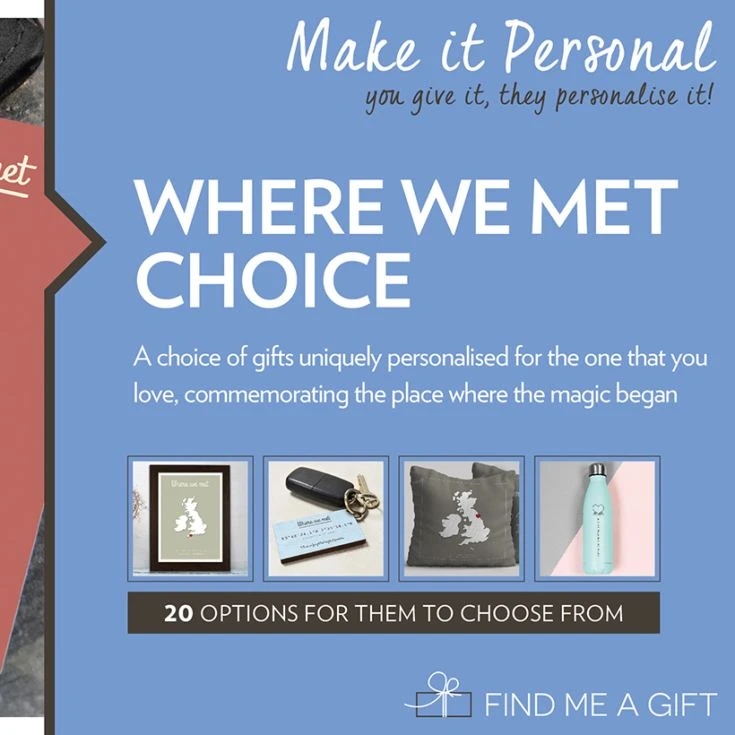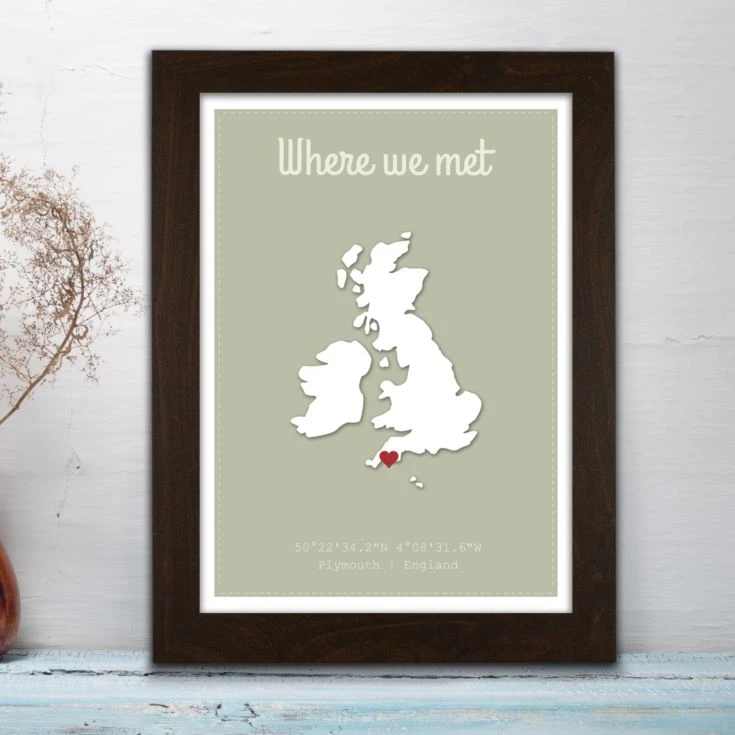 The popular design, originated by in-house creatives, features a small heart as a pinpoint of the exact coordinates where the happy couple met on a silhouetted map of the United Kingdom. Underneath can be personalised with the location and country.